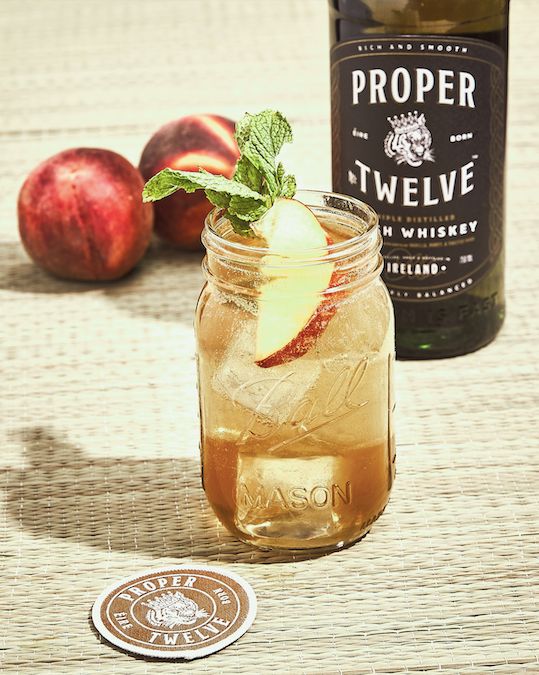 Muddle peaches, simple syrup & mint leaves in a shaker. Add Proper No. Twelve and fill shaker with ice. Strain into rocks glass over fresh ice. Top with a splash of soda water. Garnish with mint leaves and a peach slice