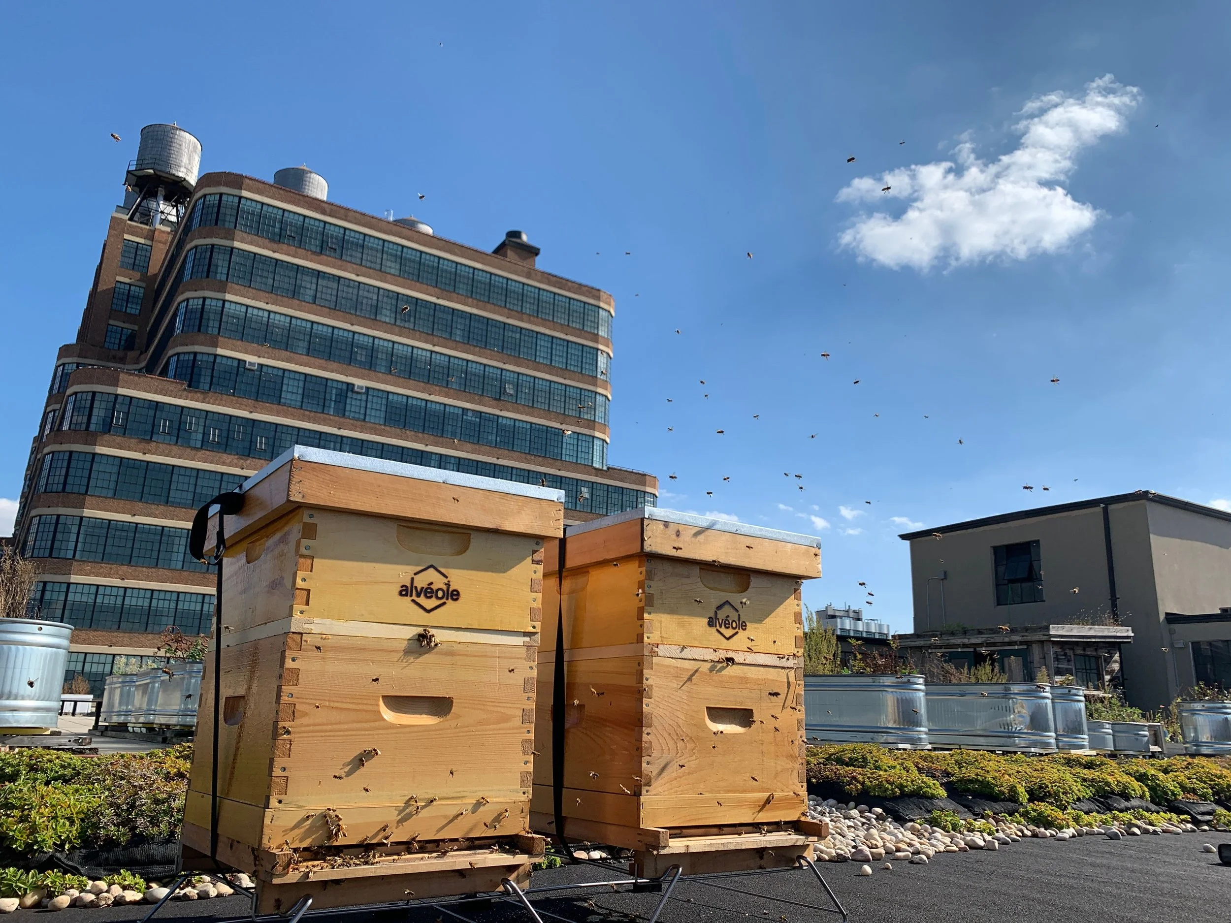 The famous Starrett-Lehigh Building in West Chelsea, owned by RXR, has a whole urban farm on its roof, including beehives run by an army of volunteer tenants who can keep track of their building’s hive through a special portal by urban beekeeping company Alvéole, who has has 116 million bees in their “bee portfolio.” The garden on top of Starrett-Lehigh has perennial flowers and bushes like Joe Pye weed, echinacea and Budlia for the bees. RXR is a huge proponent of supporting biodiversity in urban areas- approximately 450,000 bees live in nine hives across seven of their buildings in 2023. The program has been so popular that RXR is adding beehives to their properties at Pier57, 230 Park, 32 Old Slip, and 75 Rockefeller.