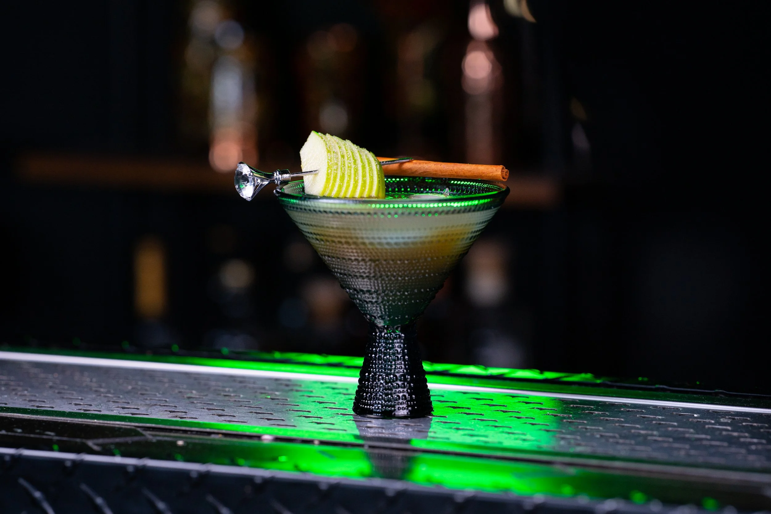 Pour ice in a glass, add Glenfiddich 14 Year Old, apple juice and 1 dash of bitters. Stir until glass is cold and add a tiny touch of grated cinnamon on top. Finish with fresh green apple slices on a stick, previously covered with raw cane sugar on each face.