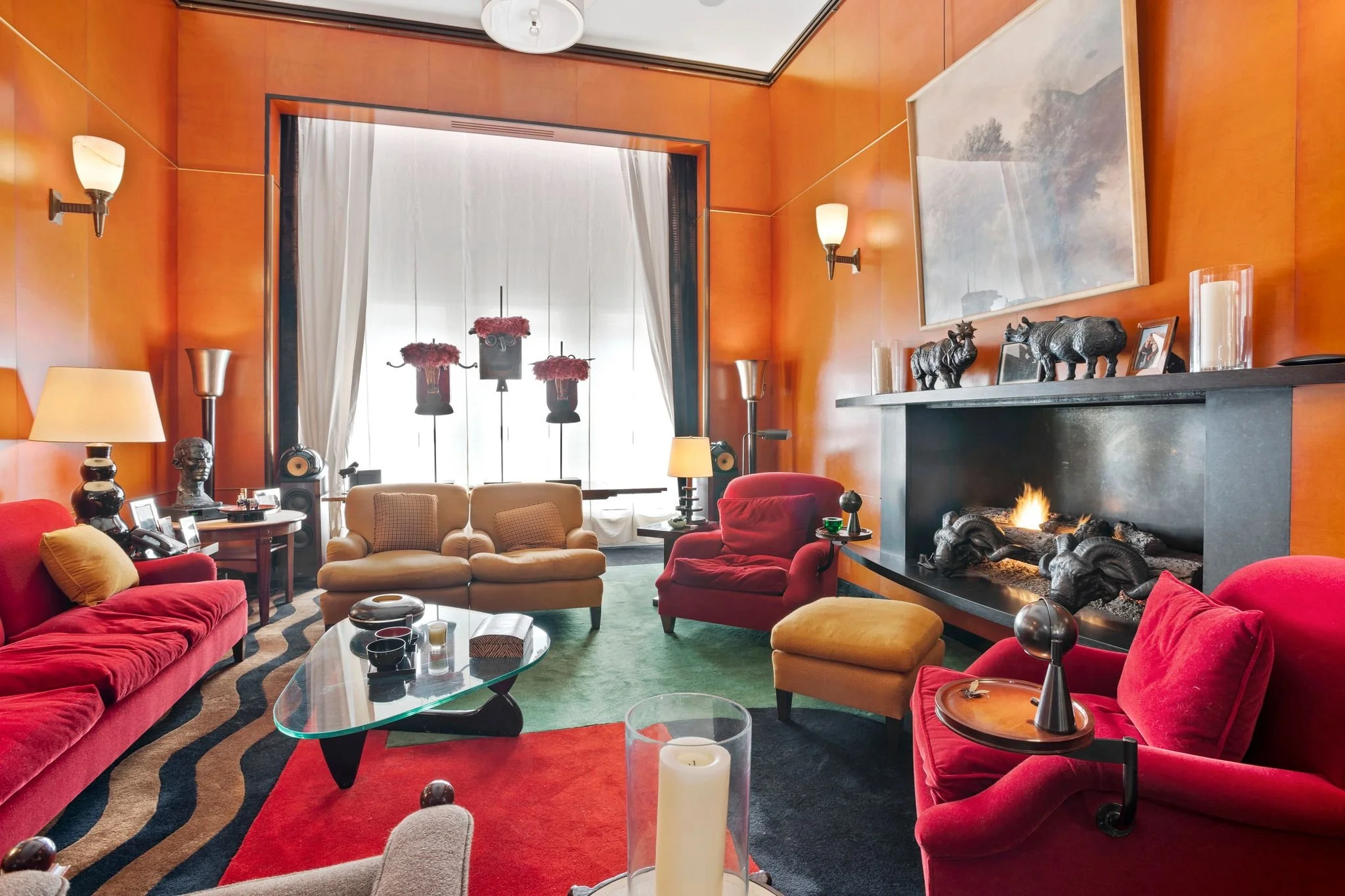 The public rooms of the apartment; a large Living Room, formal Dining Room and Library are all accessed from a well-proportioned and elegantly detailed Gallery which is entered from a private elevator vestibule. The Living Room has a wood burning fireplace, the Dining Room, with its built in storage and dry bar is decorated with hand painted deGournay wallpaper. The south facing Library, with three large windows and floor to ceiling bookcases has a "secret" door that provides access to the two exposure Primary Bedroom; this room easily does double duty as a private retreat for the owner.