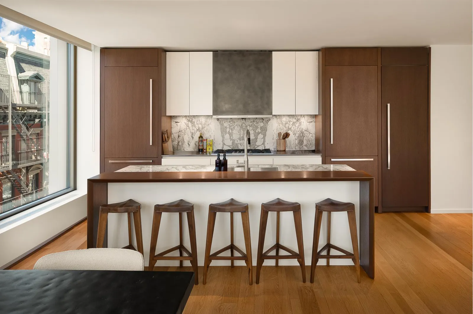 Listed for $4.95M by Douglas Elliman’s Erin Boisson Aries and Nic Bottero, this spectacular corner three-bedroom residence at 75 Kenmare is the epitome of downtown sophistication. Designed by Lenny Kravitz’s Kravitz Design in collaboration with architect Andre Kikoski, the building blends edgy glamour with elevated luxury. Bathed in southwestern light, the residence features open-concept living with hardwood floors, skyline views, and a chef-caliber kitchen outfitted with Gaggenau appliances, an oversized marble island, and sleek integrated cabinetry.