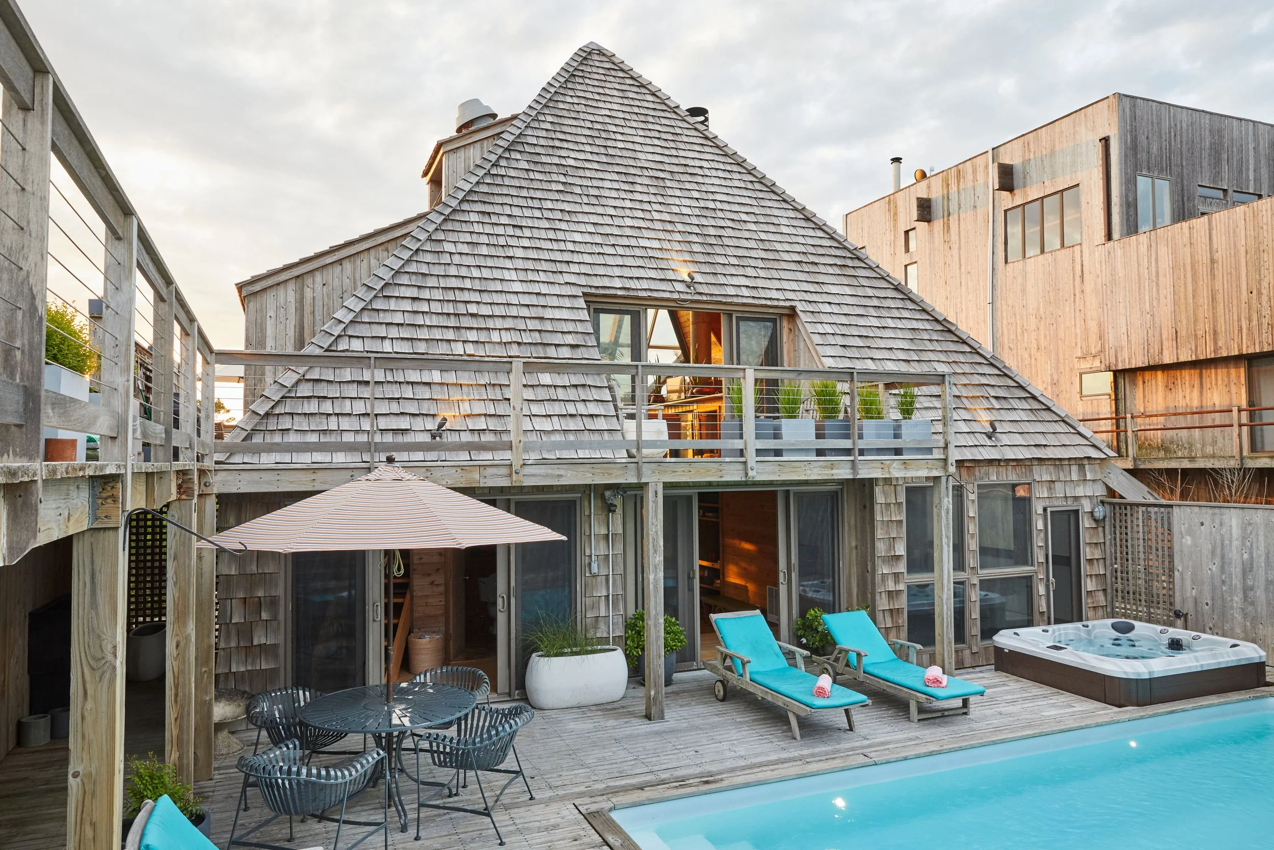 The Legendary Pyramid House is an undisputed architectural masterpiece (b. 1961, renovated in 2006 by architect Hal Hayes). It offers an irreplicable site, unbelievable views, true mid-century style, unparalleled peace and privacy, and sophisticated yet unpretentious living. The centerpiece is the great room with its soaring ceiling and wall of glass (living room, kitchen and dining) overlooking the dunes (Fire Island National Seashore), the ocean and the bay. Beneath, the enormous primary suite (dressing room, large bathroom and private study) looks out to the dunes on one side and the pool deck on the other. Across the pool deck are 2 guest cabana bedrooms and a bathroom in between, all in the shape of pyramids. Cooling ocean breezes flow day and night in this sophisticated, relaxed compound. Multiple decks and work areas in the home offer privacy and convenience and graceful separation of space. A trophy home that has the potential to produce extraordinary income.