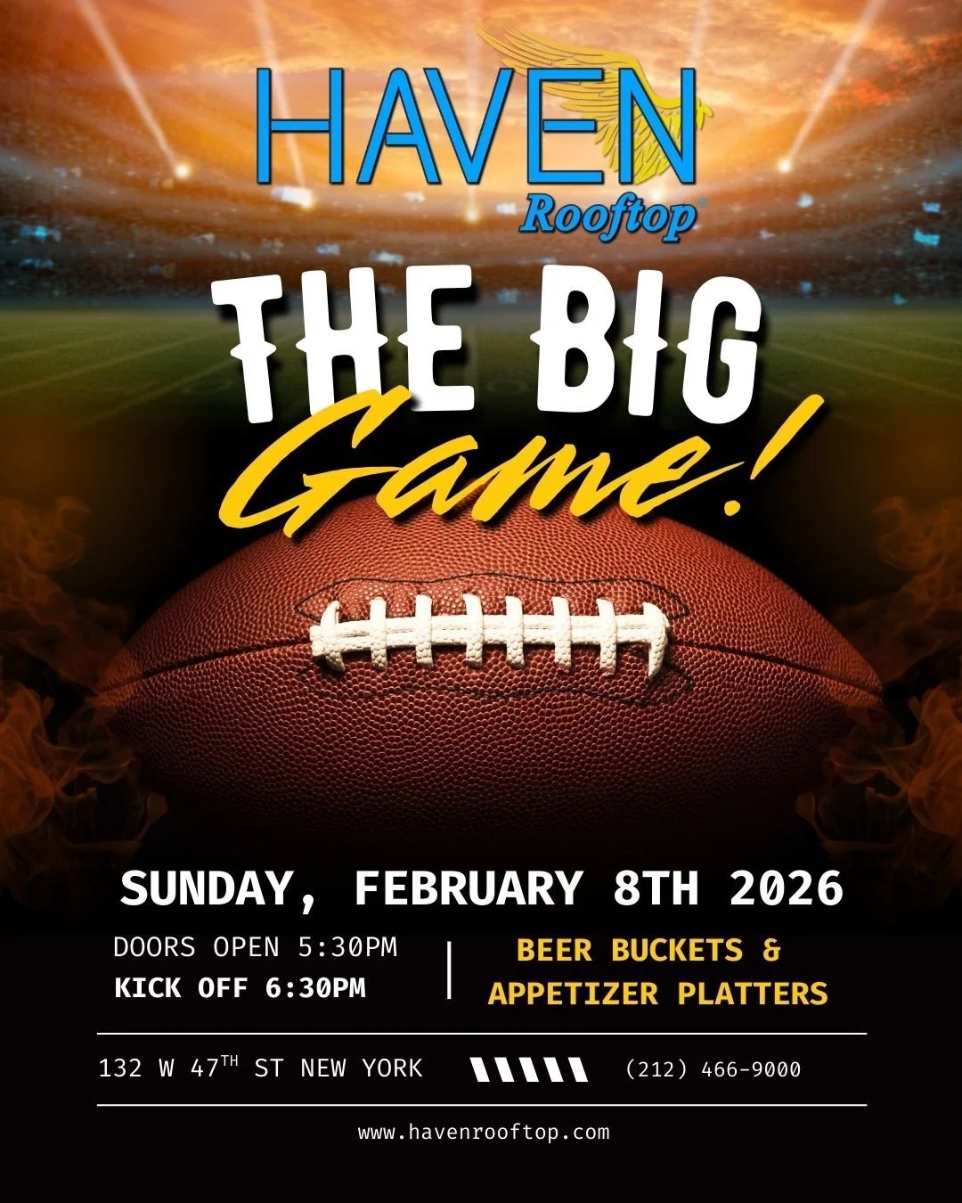 Join the crowd at Haven Rooftop (132 W 47th St) for the ultimate Super Bowl LX viewing experience on Sunday, February 8th. Get ready for an electric game-day atmosphere with stadium-style excitement in the heart of Midtown. Doors open at 5:30 pm, with kickoff at 6:30 pm. Guests can enjoy beer buckets and appetizer platters throughout the night while watching the game surrounded by fellow fans. Bring your team spirit, grab a drink, and settle in for an unforgettable Superbowl Sunday at Haven Rooftop.