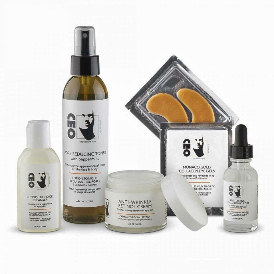 An all-natural skincare for men. Included in this collection are 5 simple products that no man should be without: Pore Reducing Toner With Peppermint : Minimize the appearance of pores on the face & body. Can also be used for bumps caused by acne, waxing, and shaving; Monaco Gold Collagen Eye Gels: Rejuvenate and revitalize in as little as 10 minutes; Anti-Aging Hyaluronic Acid: For visibly youthful looking skin, with 2% Hyaluronic Acid; Anti-Wrinkle Retinol Cream: Improve the look of contours & wrinkles while intensely hydrating cream with 2.5% Retinol; Retinol Gel Face Cleanser: Daily use will help transform the appearance of aging skin to its youthful beginnings for optimized elasticity and firmness, reduced fine lines and wrinkles, and hydrated, clearer skin.