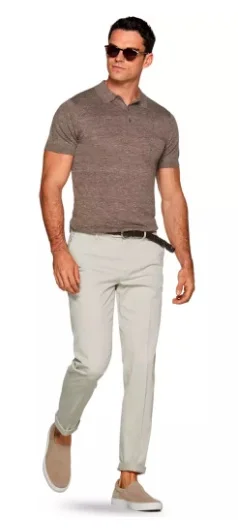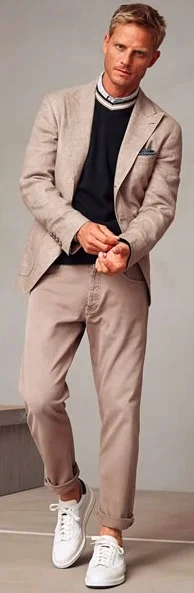 The pants you do not have to roll up, if they are hemmed to the right length of where your shoe ends that is perfect. Keep the footwear on the more casual side to avoid the whole look looking way too formal (with an oxford or brogue).
