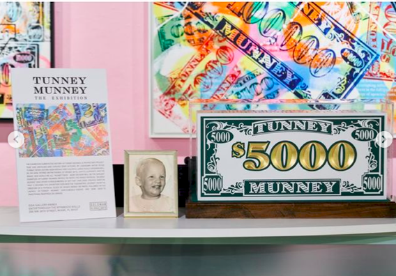 Also on view will be the earliest examples of Tunney Munney, works on paper, the famed physical “munney blocks,” and other curious works of art that have been created over the past 2 decades. The exhibition explores the fascinating journey from the creation of a physical block of money, works on paper, followed by the launch of Tunney Munney non-fungible tokens, and now back to traditional paintings on canvas.