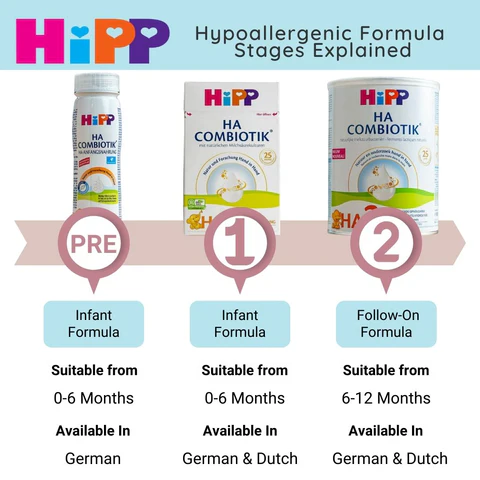 HiPP Hypoallergenic (HA) formula is a groundbreaking addition to HiPP's product line, designed to cater to the needs of sensitive infants. It offers a gentle yet nourishing option for babies prone to allergies, making it a valuable choice for parents navigating dietary challenges. Backed by over 25 years of research, this formula is crafted with extensively hydrolyzed milk proteins that are easier for little tummies to digest, along with essential prebiotics and probiotics to support a healthy gut microbiome and immunity. Free from common allergens, HiPP HA formula is non-GMO and devoid of artificial additives, ensuring pure nutrition for your baby.